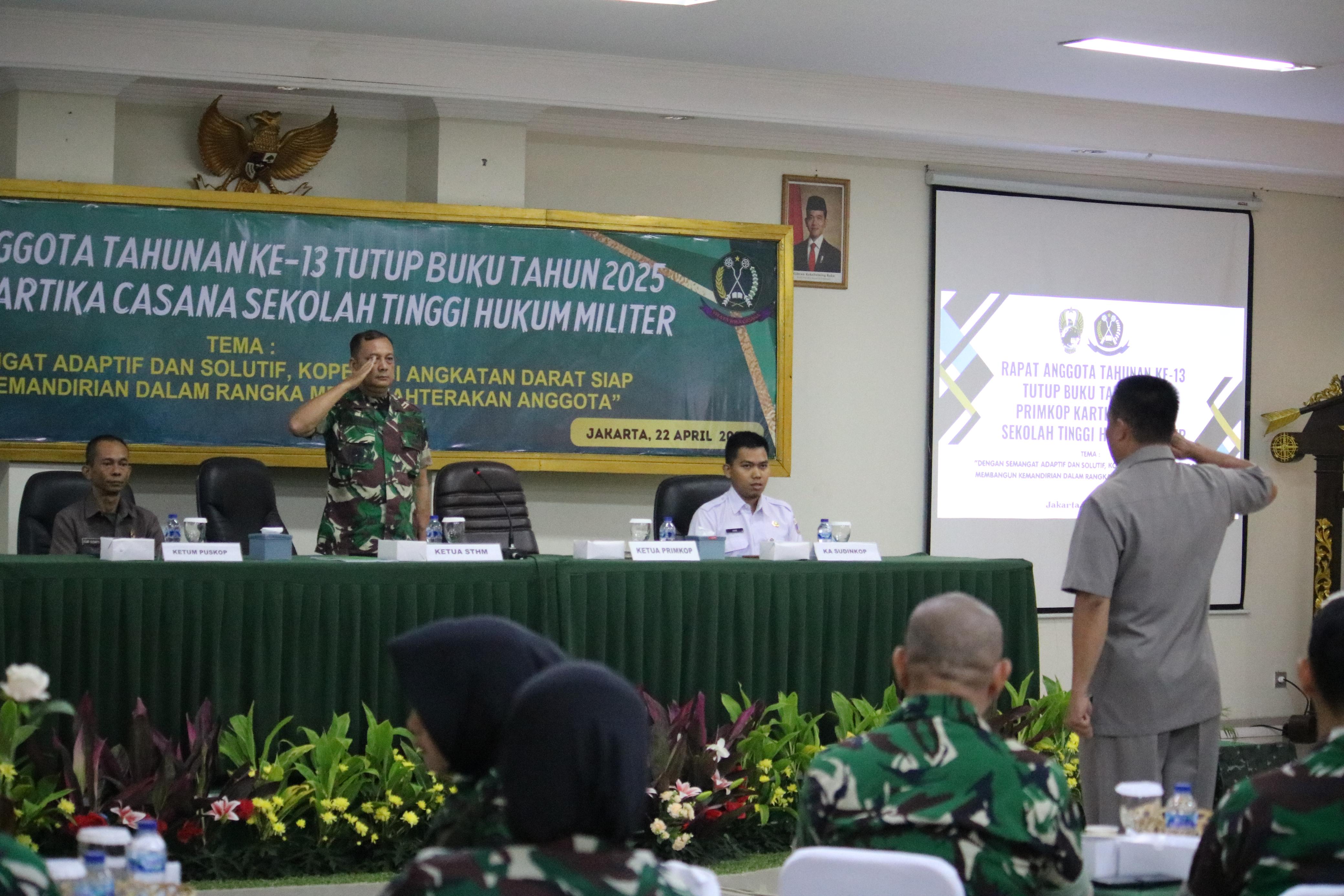 Jakarta, sthm.ac.id - Koperasi Sekolah Tinggi Hukum Militer (STHM) menggelar Rapat Anggota Tahunan (RAT) sebagai bentuk pertanggungjawaban pengurus kepada anggota sekaligus sarana evaluasi dan perencanaan program kerja ke depan, yang diikuti oleh seluruh personel STHM, bertempat di Aula STHM, Jalan Matraman Raya, Jakarta Timur, Rabu (22/4/26)