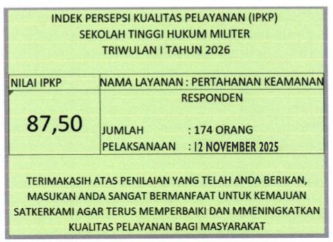 Selanjutnya, hasil pengolahan terhadap kuesioner Survei Persepsi Kepuasan Pelayanan (SPKP) Sekolah Tinggi Hukum Militer (STHM) Triwulan IV Tahun 2025 menunjukkan bahwa tingkat kepuasan pelayanan yang diberikan oleh STHM berada pada kategori sangat baik (A). Capaian tersebut tercermin dari Nilai Indeks Kepuasan Masyarakat (IKM) yang mencapai 4,38 atau setara dengan 87,50 dalam skala konversi.